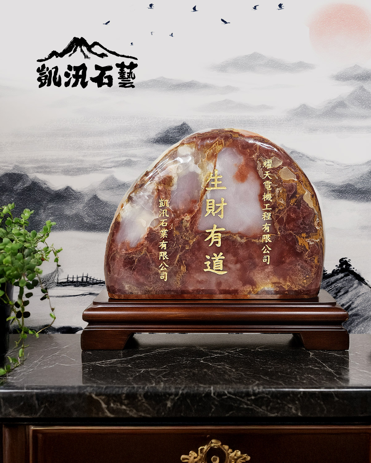 ✅ 可於石面或底座刻上祝福字句(如「生財有道」、「財源滾滾」、「事業有成」)